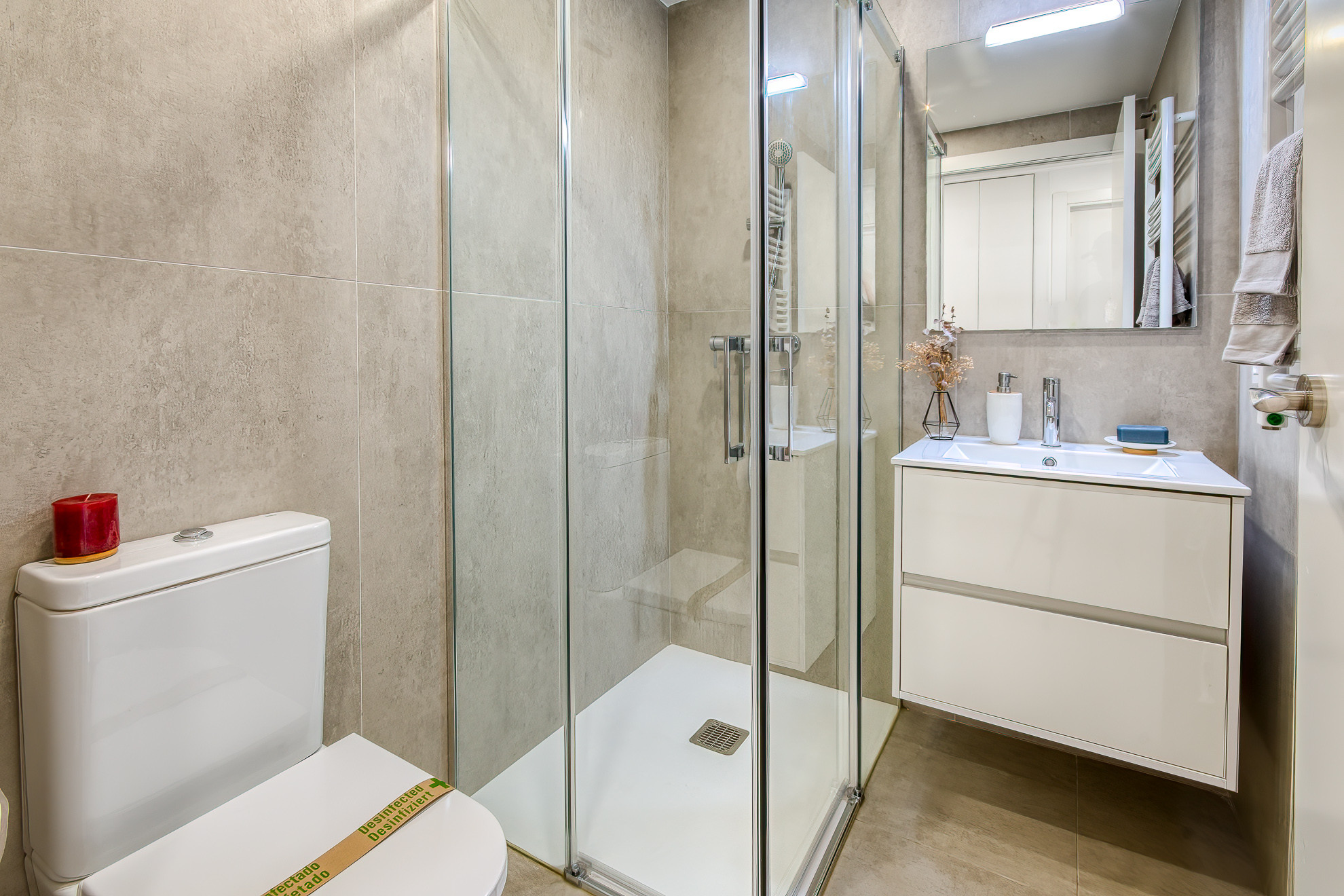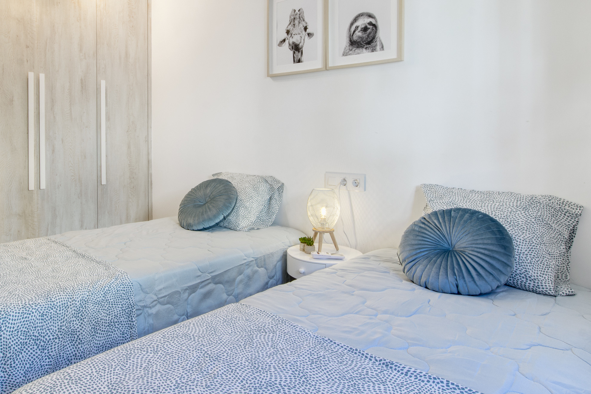 L’apartament compta amb un dormitori principal amb llit extragran (180x200 cm), televisió i bany privat amb dutxa, i un segon dormitori amb dos llits individuals (90x200 cm). També disposa d’un segon bany complet, també amb dutxa. La cuina és oberta, amb illa central, i està perfectament equipada amb nevera, congelador, forn, microones, rentaplats, cafetera de càpsules, torradora, bullidor d’aigua i tots els estris necessaris per cuinar i menjar.