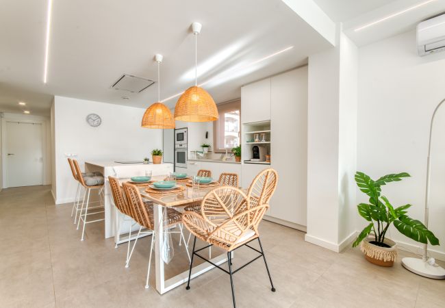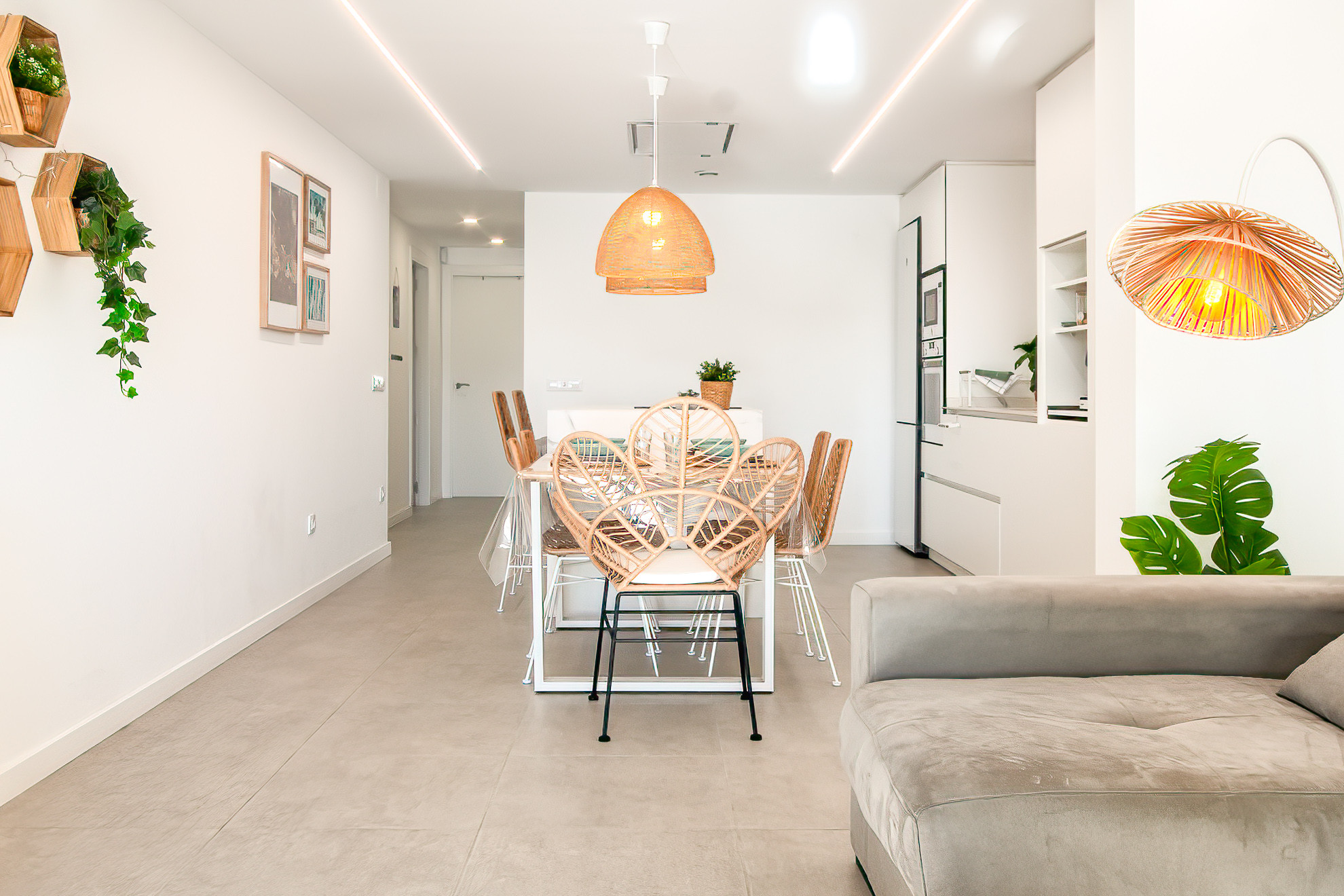 La zona de menjador i sala d’estar és àmplia i còmoda, ideal per relaxar-se després d’un dia de platja. A més, la terrassa privada de 9 m² està equipada amb taula i cadires, perfecta per gaudir dels àpats a l’aire lliure.