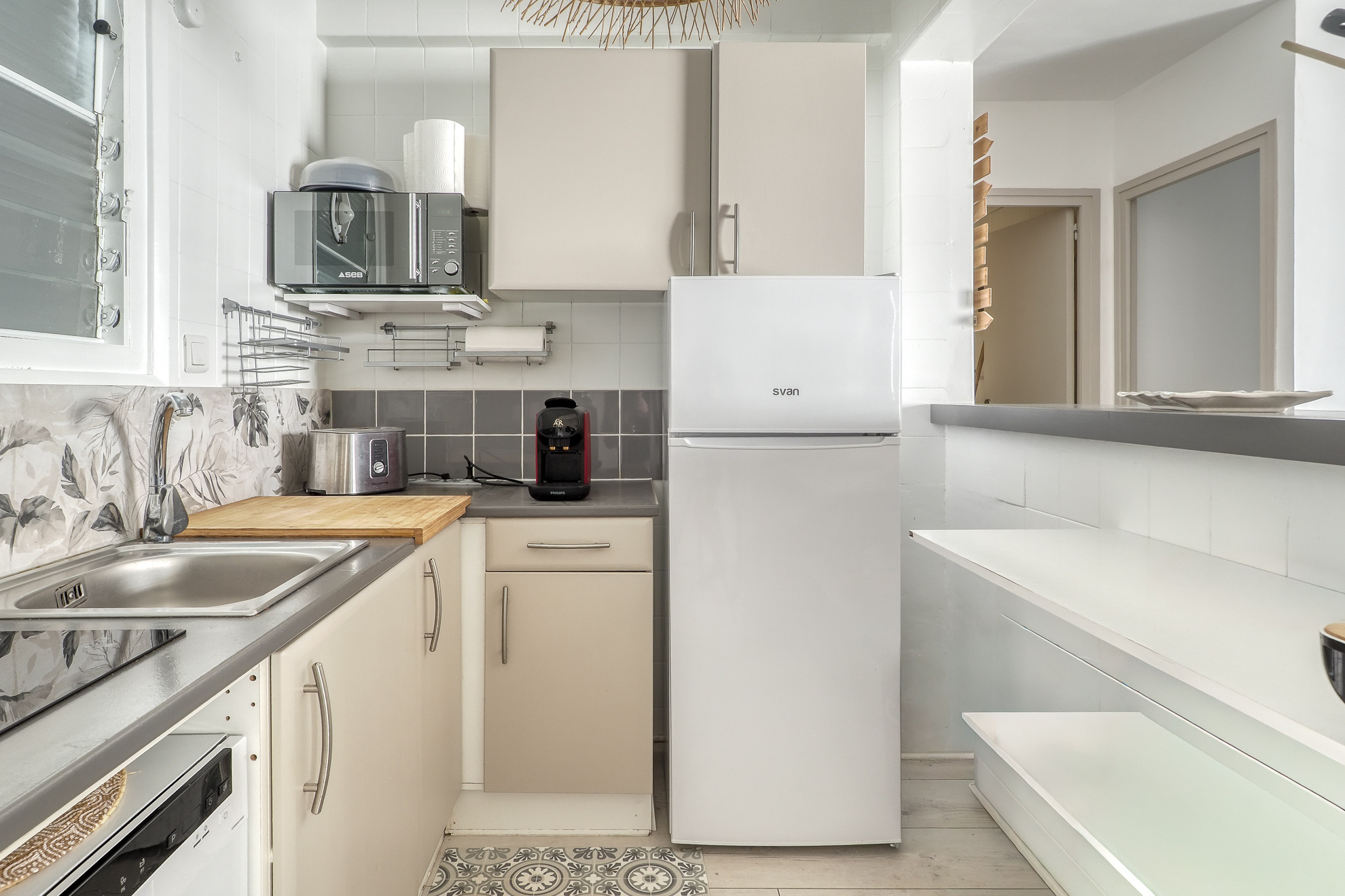 Pel que fa a les comoditats interiors, l'apartament compta amb una cuina americana totalment equipada amb electrodomèstics, incloent nevera, microones i congelador. La vaixella i coberteria necessàries estan disponibles, així com una cafetera per gaudir d´un deliciós cafè al matí.