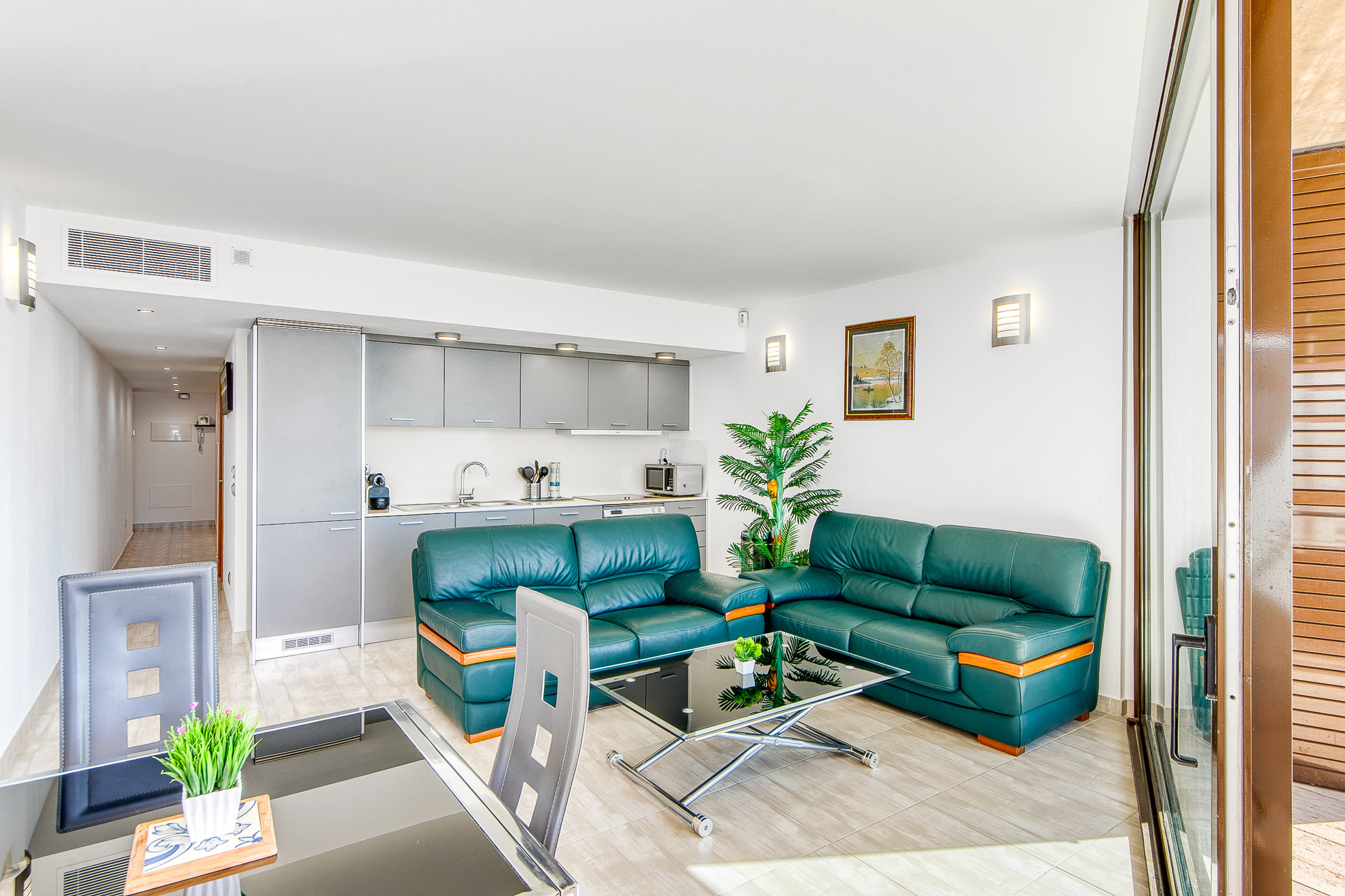 Pel que fa a les comoditats interiors, l'apartament compta amb una cuina americana totalment equipada amb electrodomèstics, incloent nevera, microones i congelador. La vaixella i coberteria necessàries estan disponibles, així com una cafetera per gaudir d´un deliciós cafè al matí.