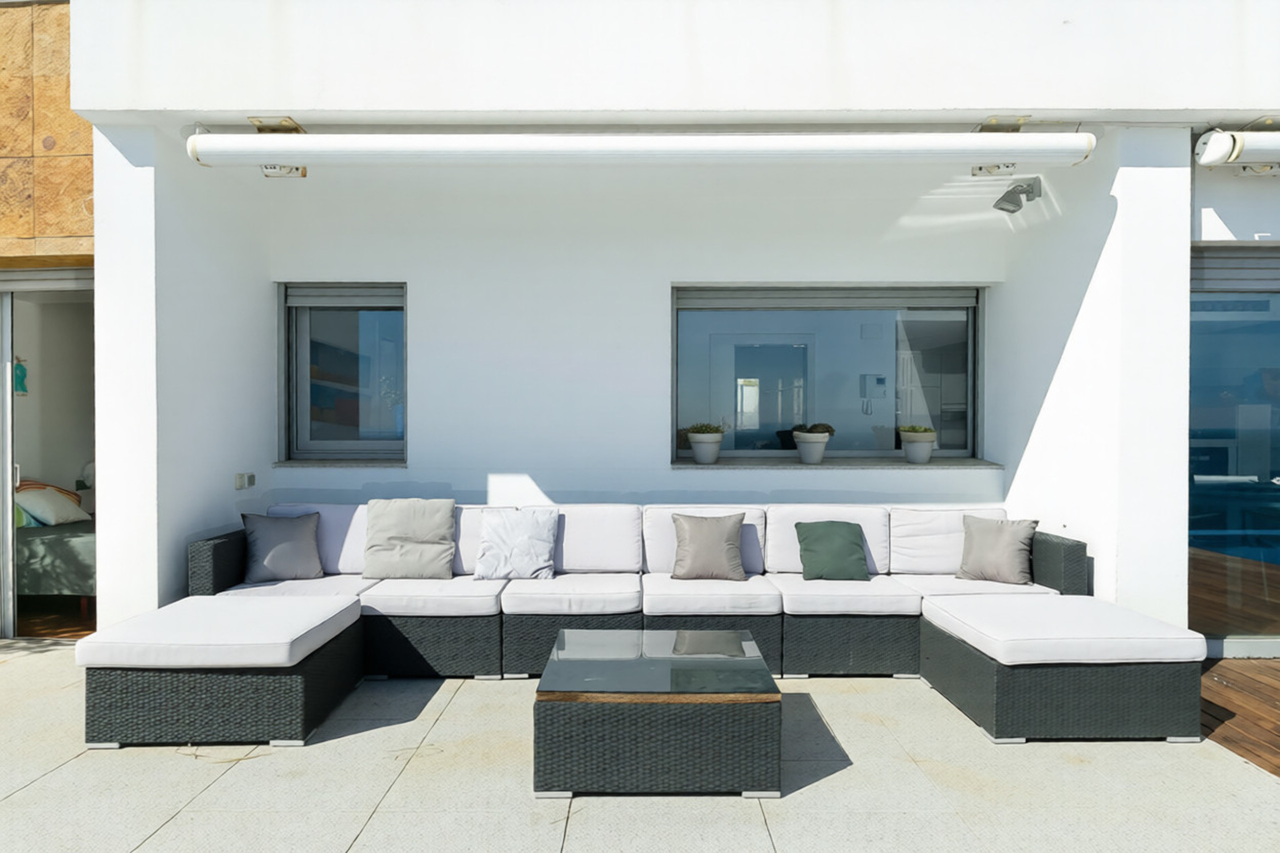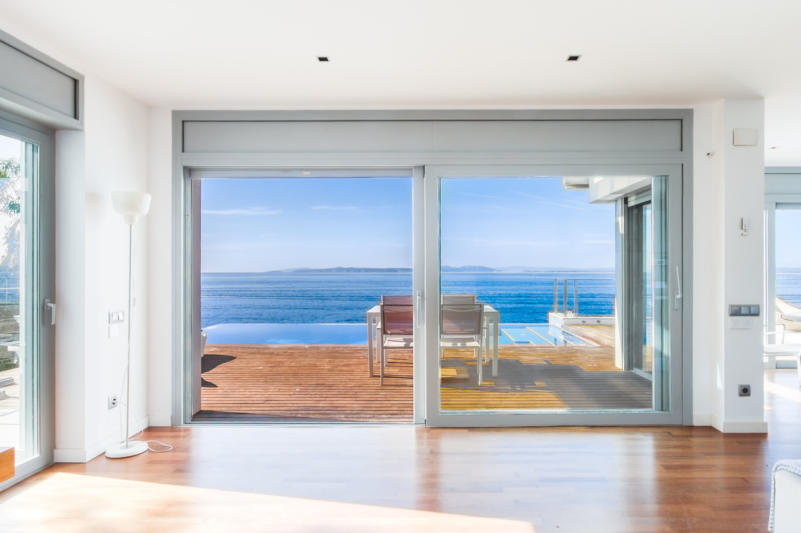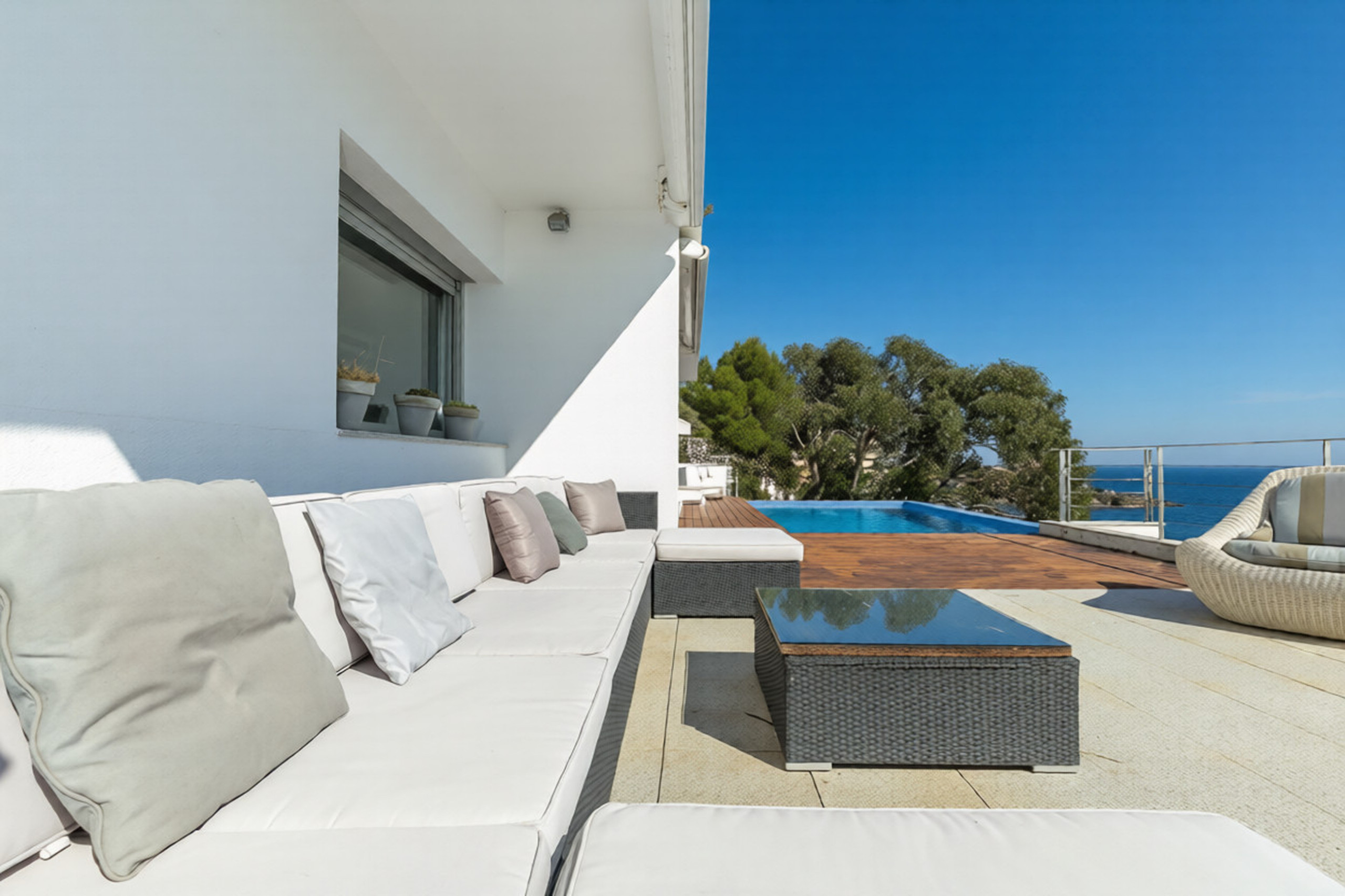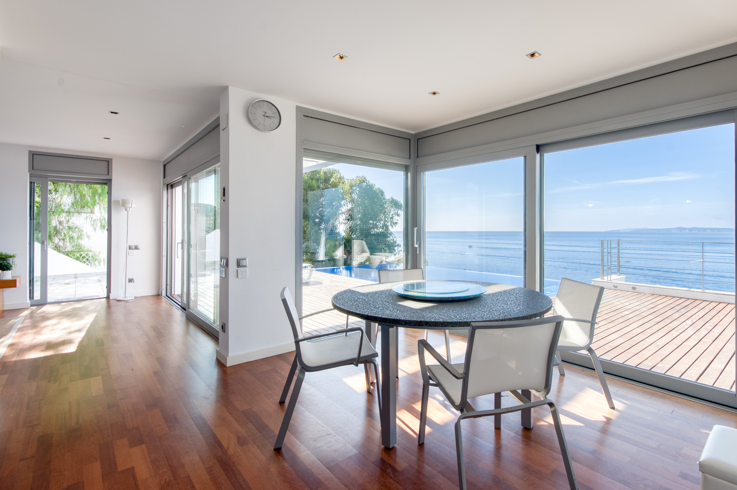 Der Salon-Esszimmer, geräumig und sehr hell, verfügt über große Fenster, die es ermöglichen, das Meer von innen zu genießen und direkten Zugang zu einer großen Terrasse mit Gartenmöbeln und zum privaten unendlichen Salzwasserpool bieten, der perfekt ist, um sich zu entspannen, während die Kleinsten das Wasser genießen.