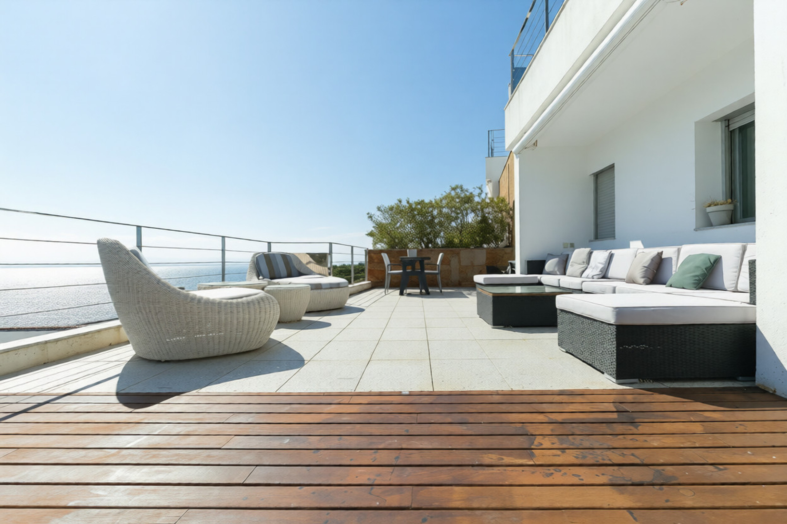 32 m² große Terrasse mit Außentisch für 8 Personen.