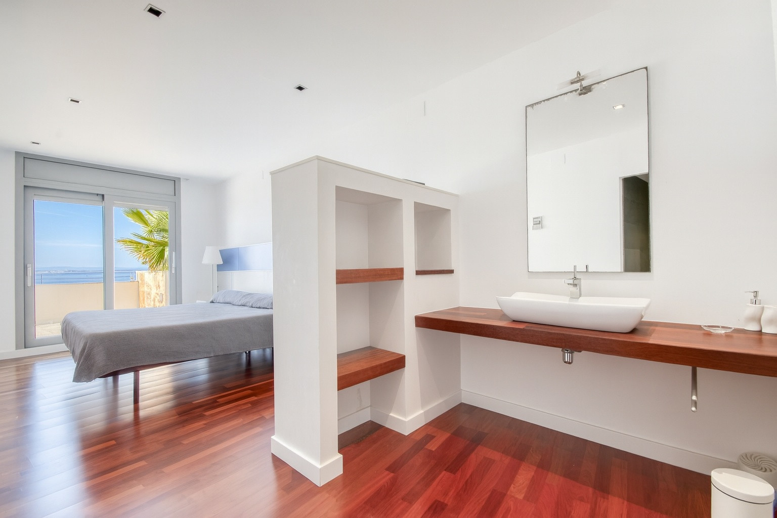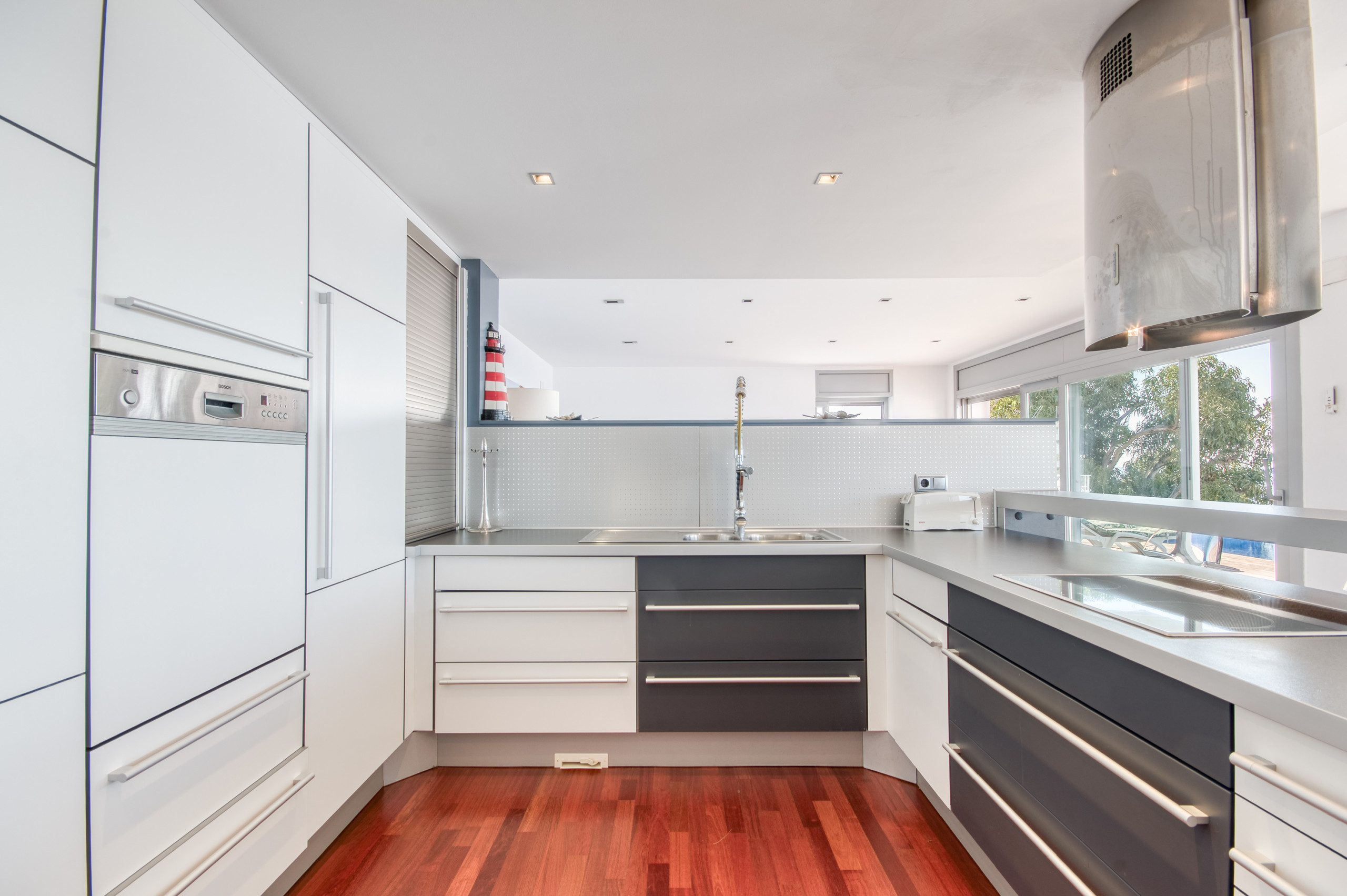Im Erdgeschoss befindet sich ein Schlafzimmer mit Doppelbett, ein komplettes Badezimmer, eine amerikanische Küche mit hochwertigen Oberflächen, in der Sie eine Paella mit Meerblick kochen und sich im geräumigen Wohn-Esszimmer mit einem großen Pflanzenschirm ausruhen können. Auf derselben Etage befindet sich die tadellose Terrasse mit mehreren Liegen zum Sonnenbaden, ein herrlicher Infinity-Pool und ein Bereich für Glutliebhaber mit einem hochmodernen Weber-Gasgrill.