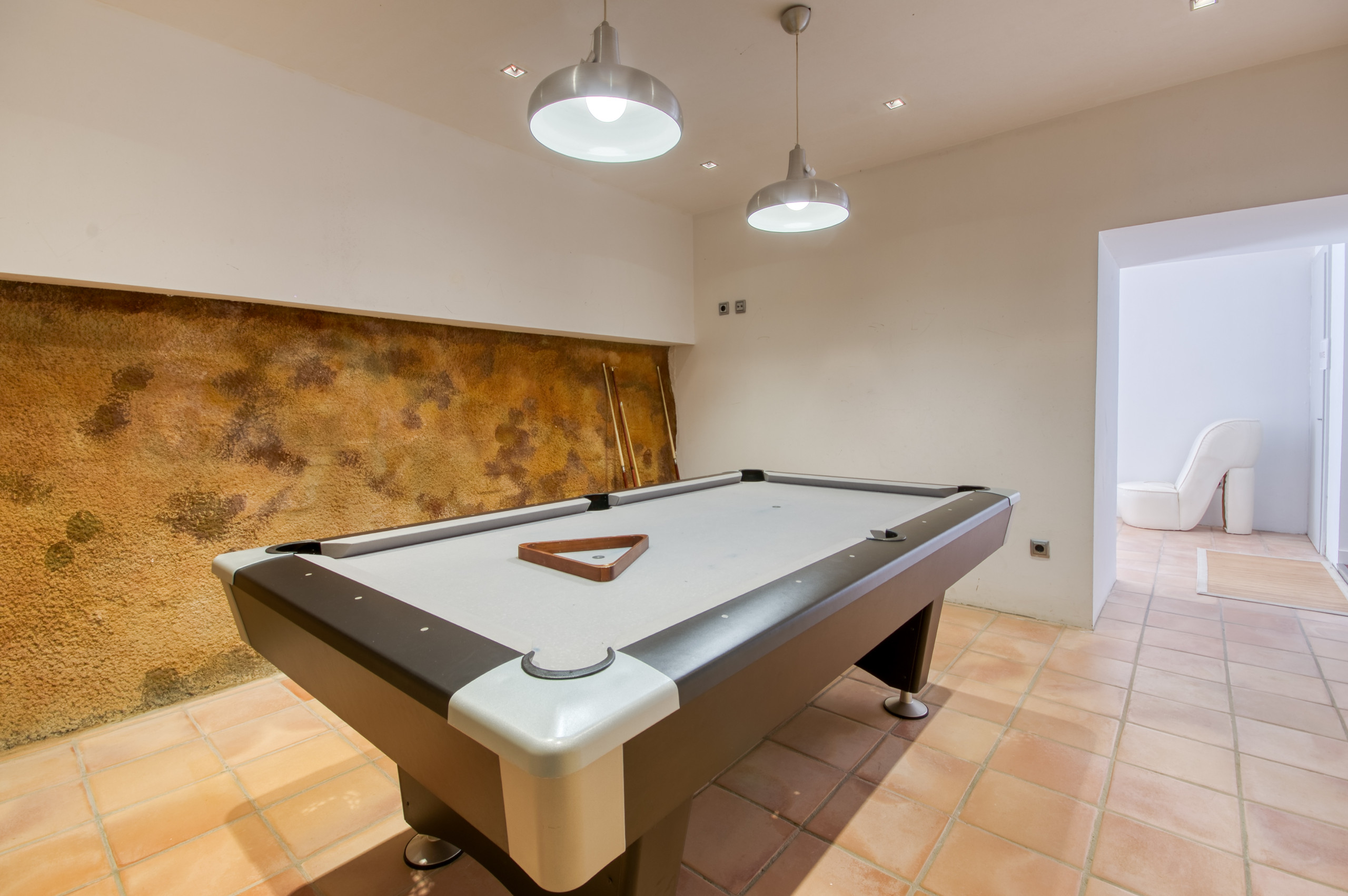 Außerdem verfügt es über ein zweites Wohnzimmer, ideal als Spiel- oder Fernsehbereich für Kinder, und einen Freizeitbereich mit Billardtisch, perfekt um Momente mit der Familie zu teilen. Wir finden auch den Waschraum und den Zugang zur geschlossenen Garage.
