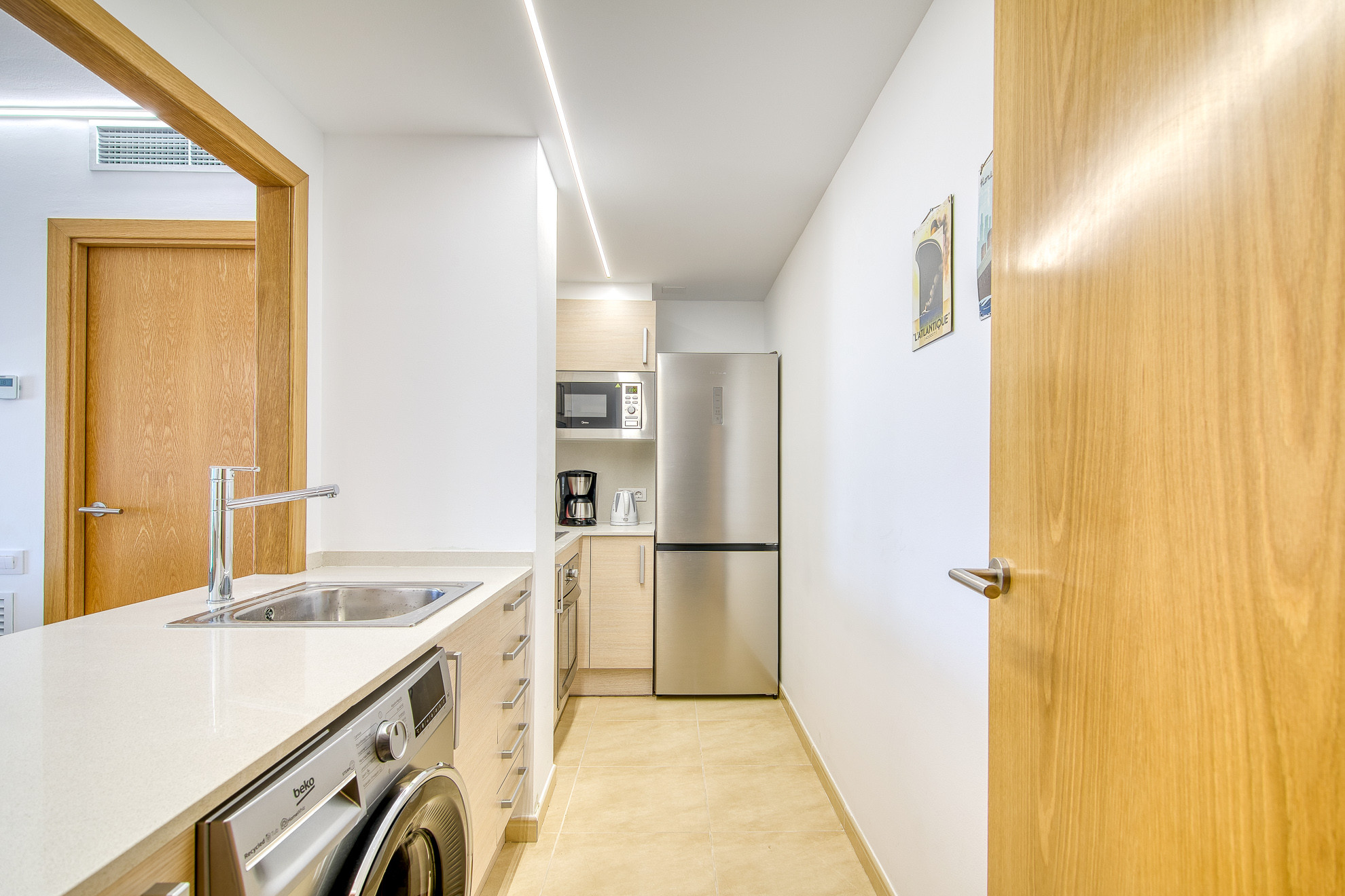Die Küche ist komplett mit modernen Geräten ausgestattet, darunter Kühlschrank, Mikrowelle, Backofen, Gefrierschrank, Waschmaschine, Geschirrspüler, Kaffeemaschine und Toaster sowie Geschirr, Besteck und Küchenutensilien.