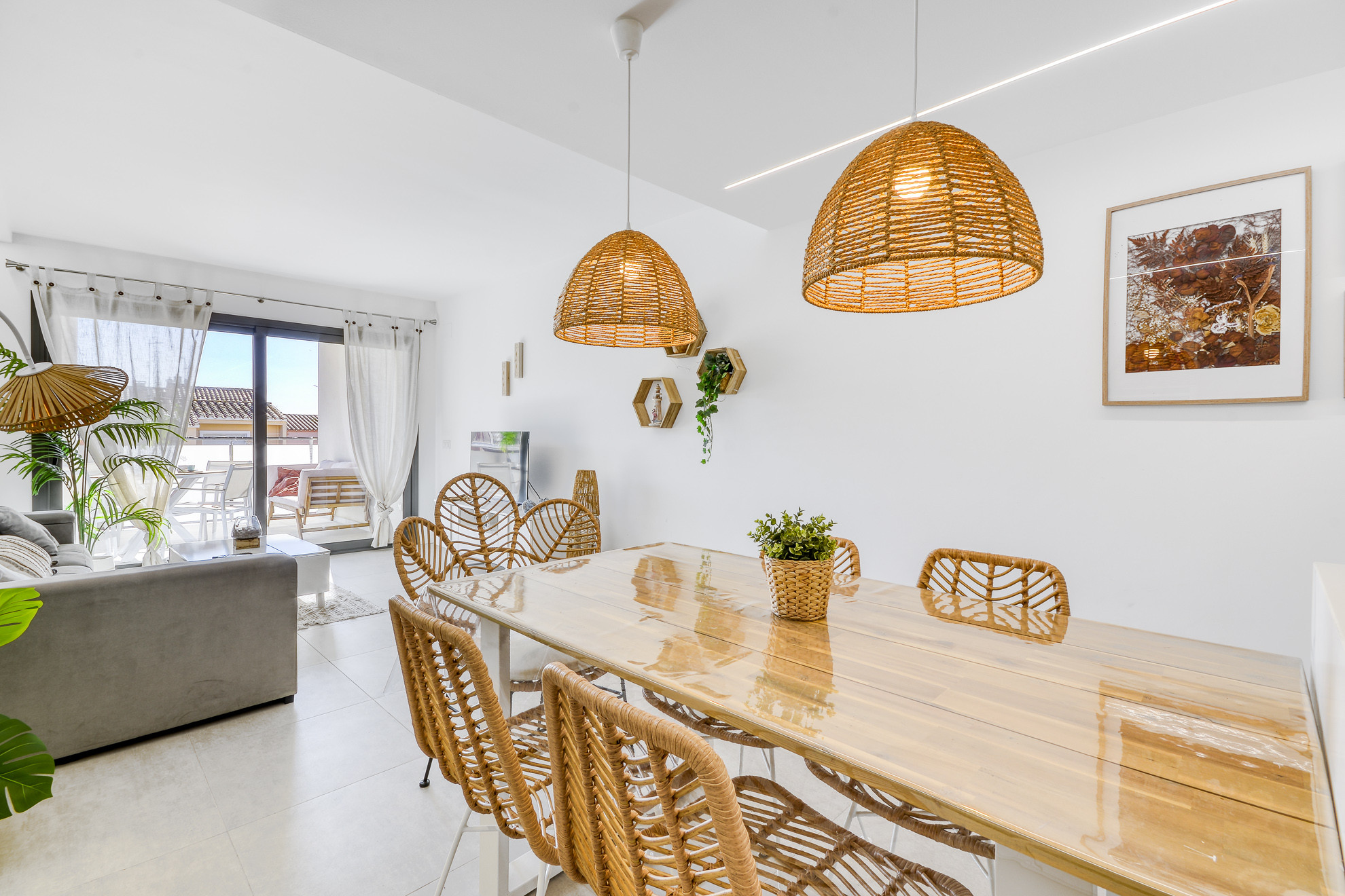 Le salon et la salle à manger sont spacieux et lumineux, parfaits pour se détendre. La terrasse privée de 9 m² est équipée d’une table et de chaises pour profiter des repas en plein air.