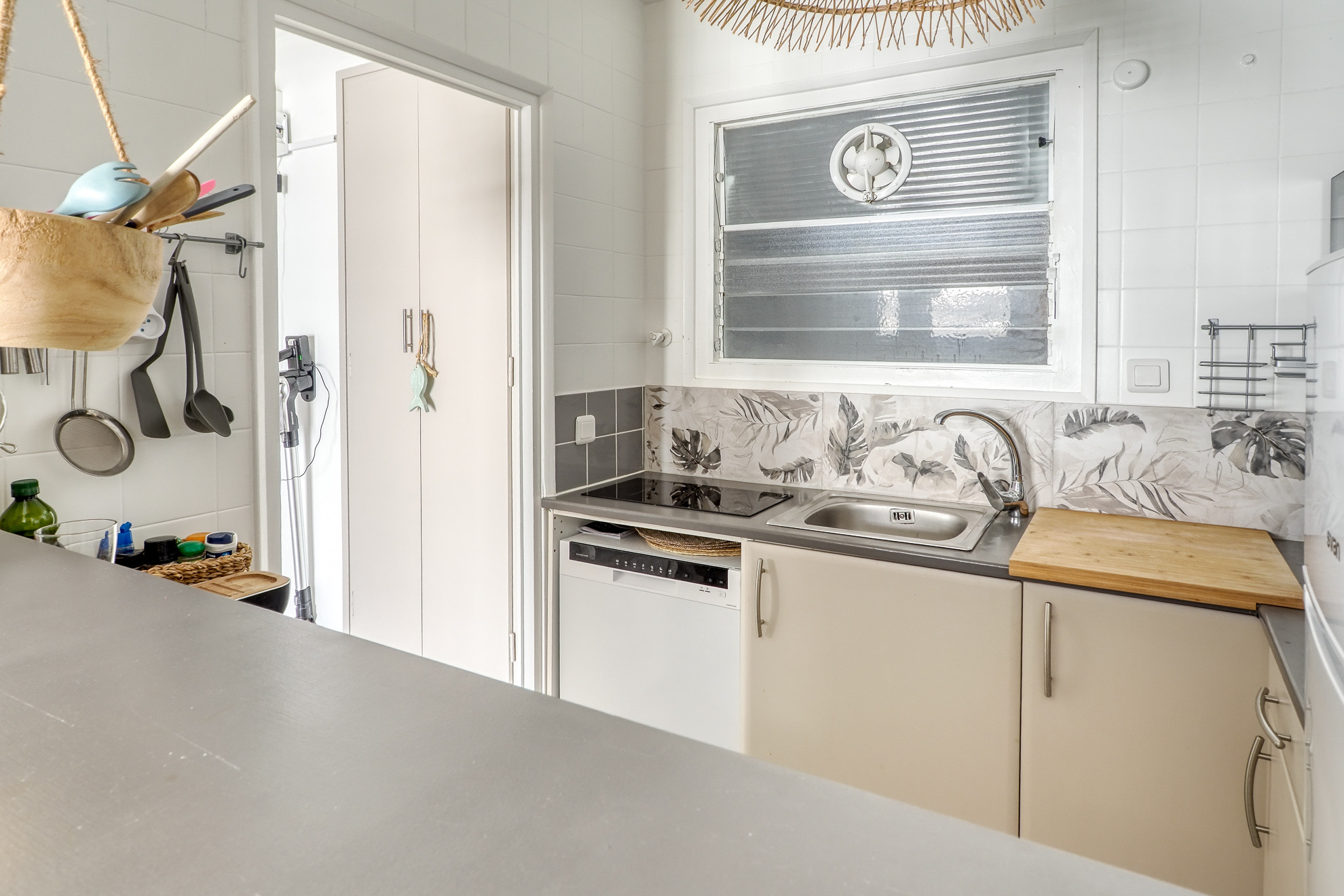La cuisine ouverte est entièrement équipée de tous les appareils nécessaires tels qu'un réfrigérateur, un four micro-ondes, un congélateur, un lave-linge, ainsi que de la vaisselle, des couverts, des ustensiles de cuisine et une cafetière, permettant aux clients de préparer leurs repas en toute simplicité et commodité.