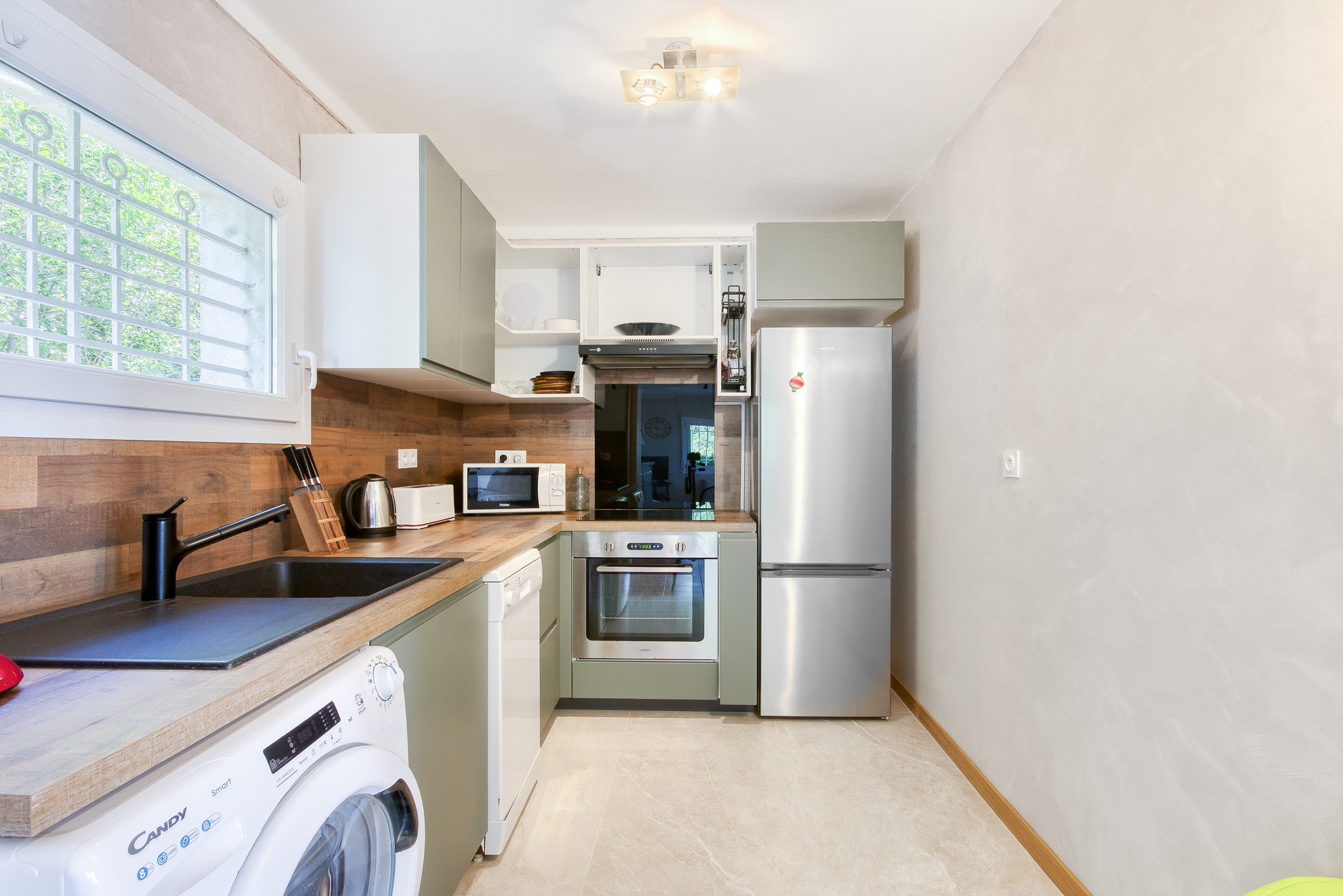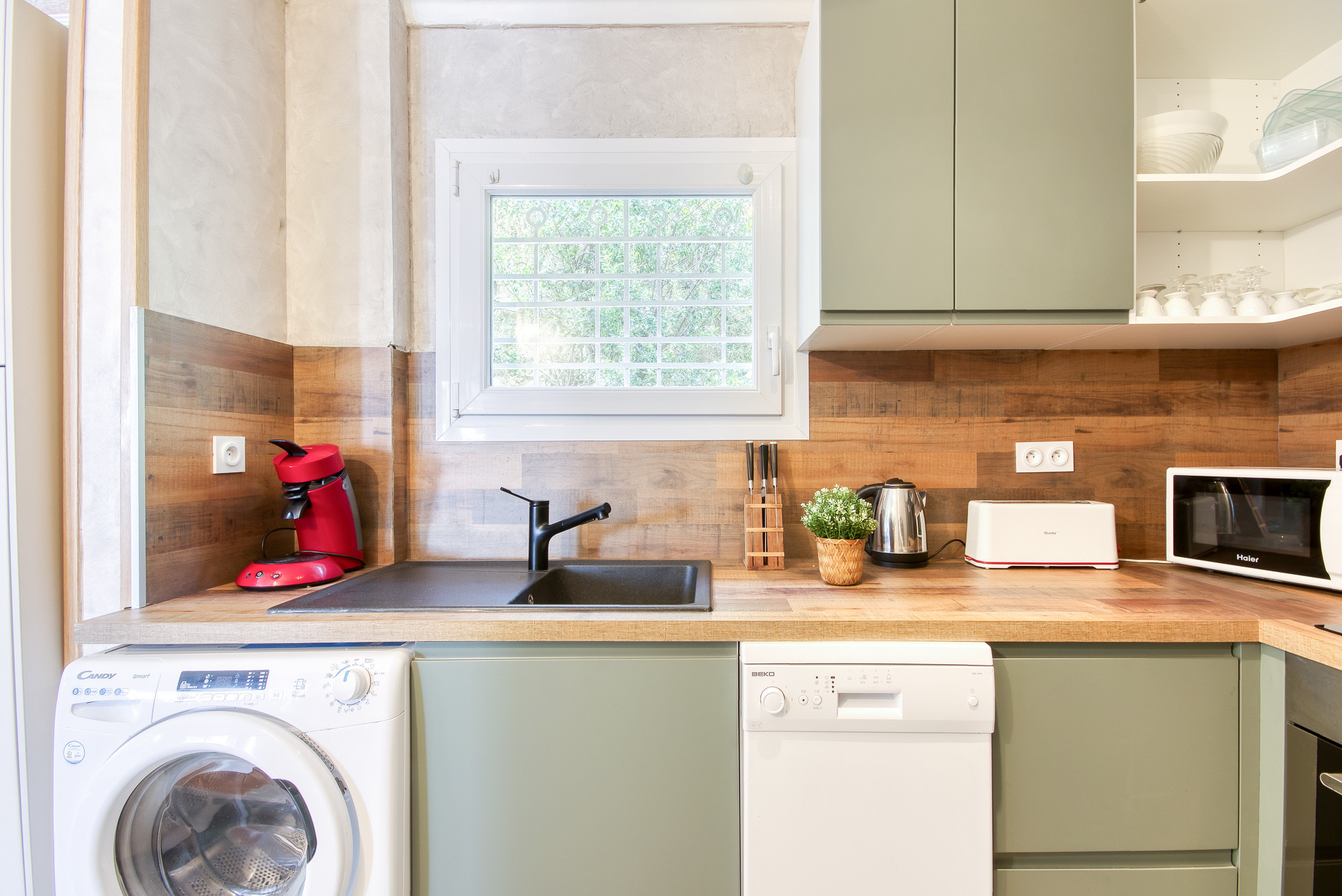 La cuisine ouverte est entièrement équipée de tous les appareils nécessaires tels qu'un réfrigérateur, un four micro-ondes, un congélateur, un lave-linge, ainsi que de la vaisselle, des couverts, des ustensiles de cuisine et une cafetière, permettant aux clients de préparer leurs repas en toute simplicité et commodité.